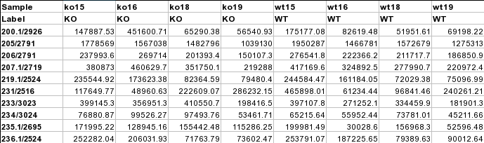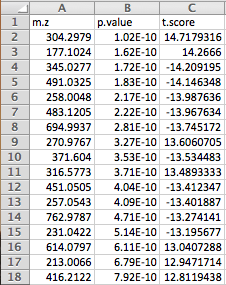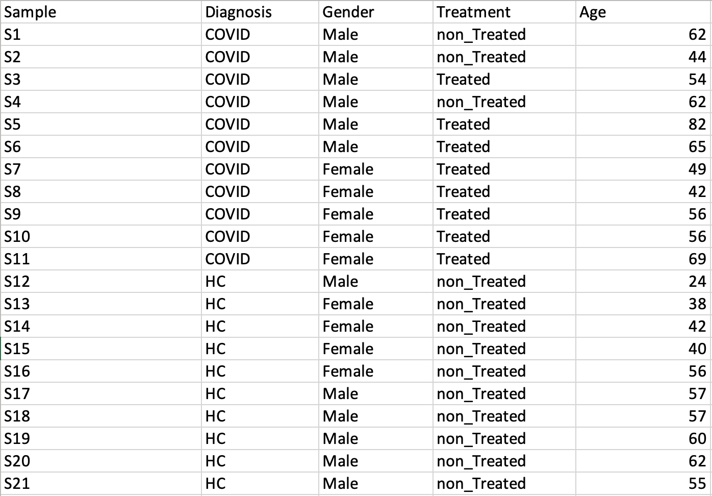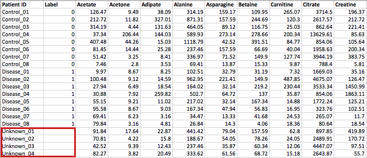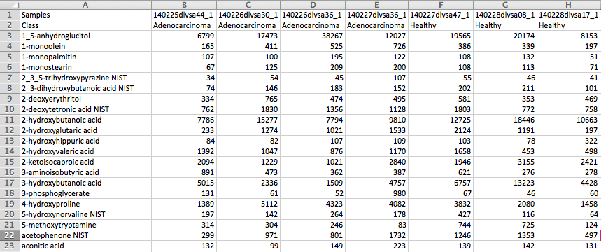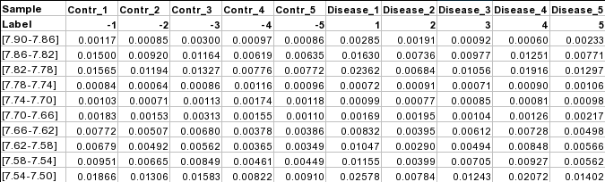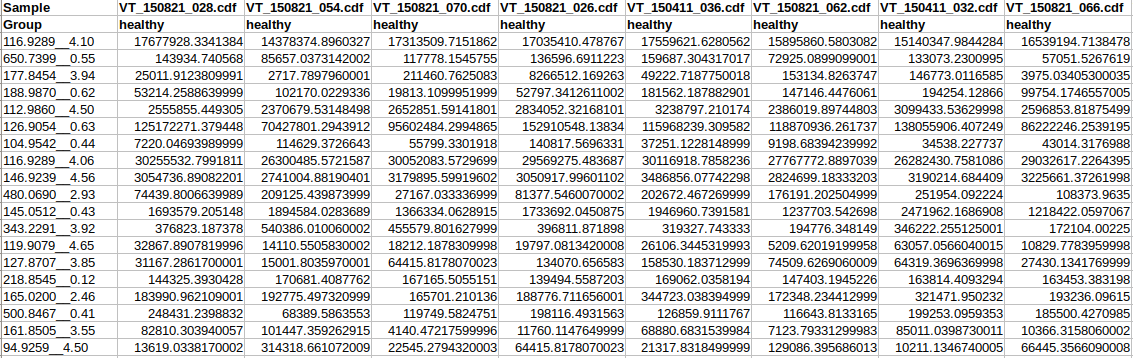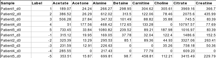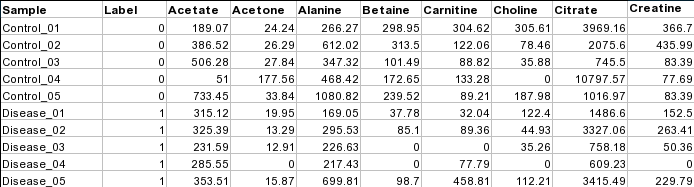 Samples in columns (paired)The screenshot below shows a subset of binned NMR spectra data (bin width 0.04 ppm). In this table, the samples from controls (e.g. Contr_1) are paired with the samples from the subjects in disease (Disease_1) based on some criteria (i.e. age, weight, gender). Each sample occupies a column and the second row is used for sample labels.